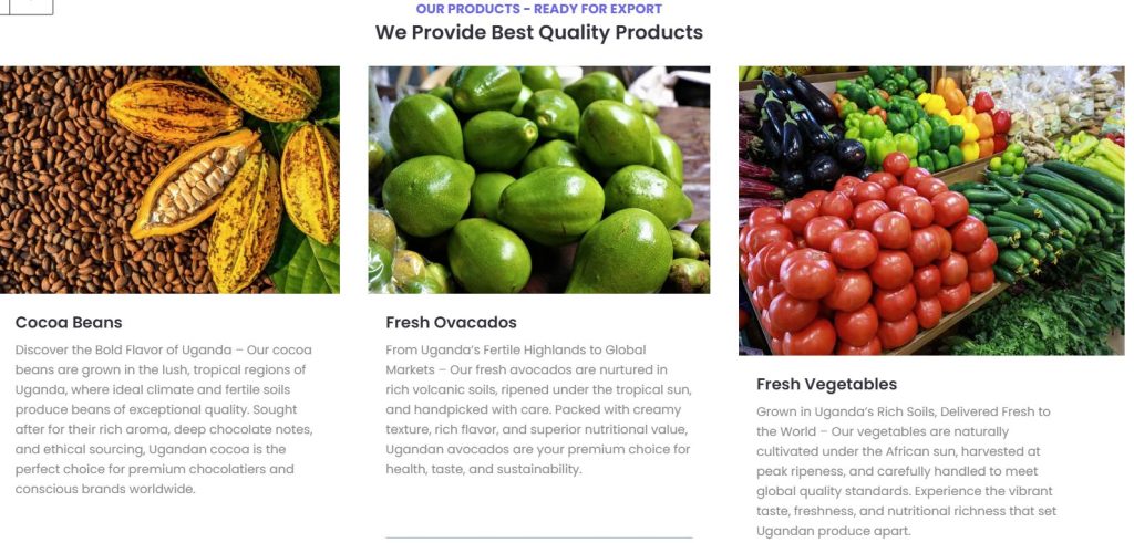 We source and export high-quality cocoa beans, fresh avocados and fresh vegetables from Uganda to the rest of the world.